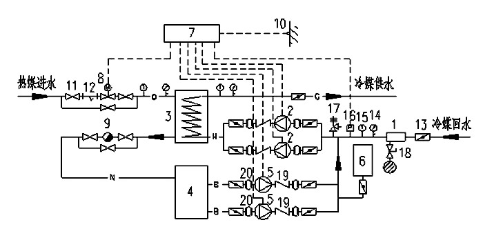 1、反冲排污过滤器2、循环泵3、换热器4、补水箱5、补水泵6、稳压罐