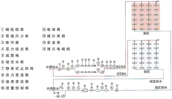 多次试验和大量实际工程运行证明,上述减压方式安全、有效,运行平衡、可靠。加之配备微机变频调控加压泵,视网上压力变化情形自动调节流量、压力,并辅之于压力监视、超压告警、水泵自启动、自关断、缓关闭等功能,这样,一个完备的高、低楼(区)直接连供暖系统就形成了。